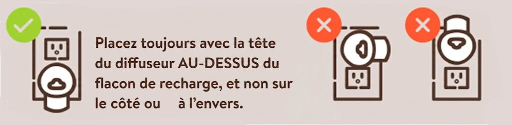 Le flacon doit toujours être positionné sous le diffuseur pour éviter toute fuite et assurer une diffusion optimale.